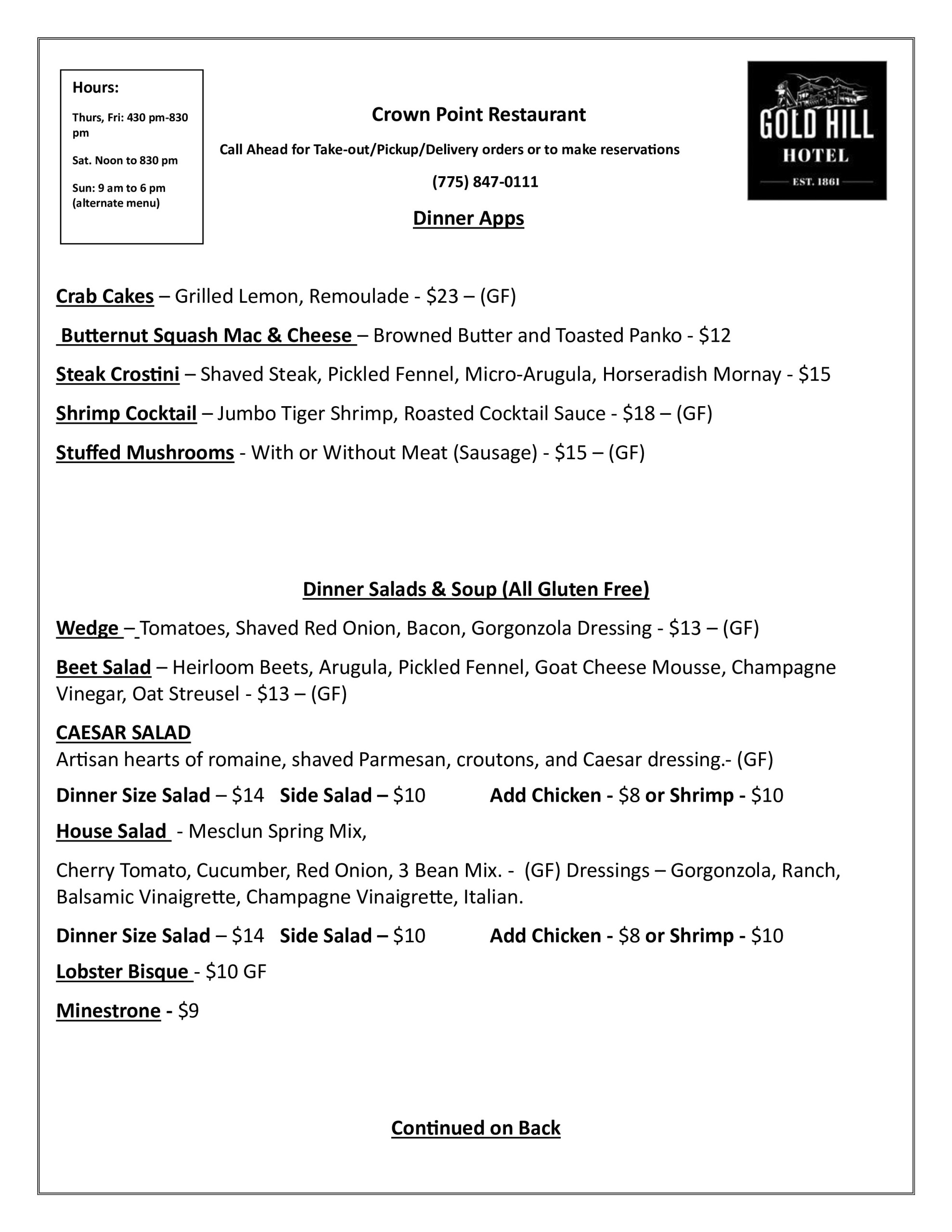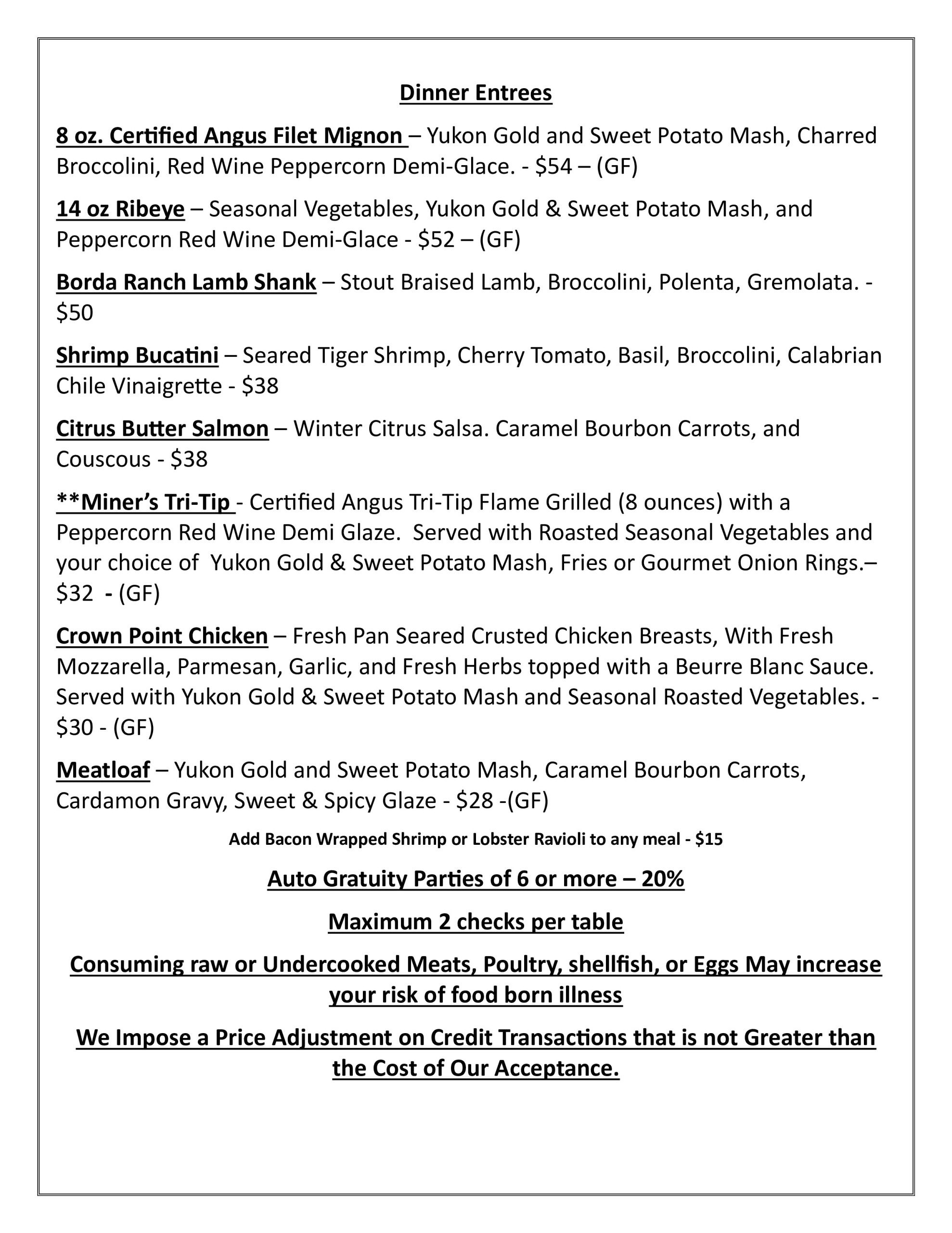 What do you say about a restaurant and saloon dripping with history? There are few places left in America with this much character. When you come to the Virginia City area it is a ‘must’ stop. Pull up a stool at the bar and order up something from our extensive selection of spirits and be transported back 150 years. Then join us in the restaurant for the best food in the Comstock! From Angus steaks flame broiled on the grill to Crown Point Chicken to Shrimp Scampi, you will find something on our delicious menu to please everyone in your party. Bon Appétit!